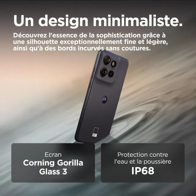 Dites hello au smartphone La rencontre de l’intelligence et de l’art Découvrez le motorola edge 50 neo, un smartphone compact qui maximise votre créativité. Derrière son aspect minimaliste et ses composants de première qualité se cache une grande élégance. il vous aidera à raconter vos plus belles histoires, grâce à moto ai qui sublimera vos photos et vidéos. Vous pourrez les admirer, les retoucher et les partager sur un écran Super HD pOLED de 6,36" (1220p) d’une qualité exceptionnelle. Le chargeur TurboPower™ 68 W vous permet d’être opérationnel rapidement pour continuer à créer. Profitez dès aujourd’hui de performances impressionnantes, et de cinq mises à jour d’OS ainsi que des mises à jour de sécurité jusqu’en 2029. C’est le motorola edge 50 neo. Bien plus qu’un téléphone. C’est une œuvre d’art.