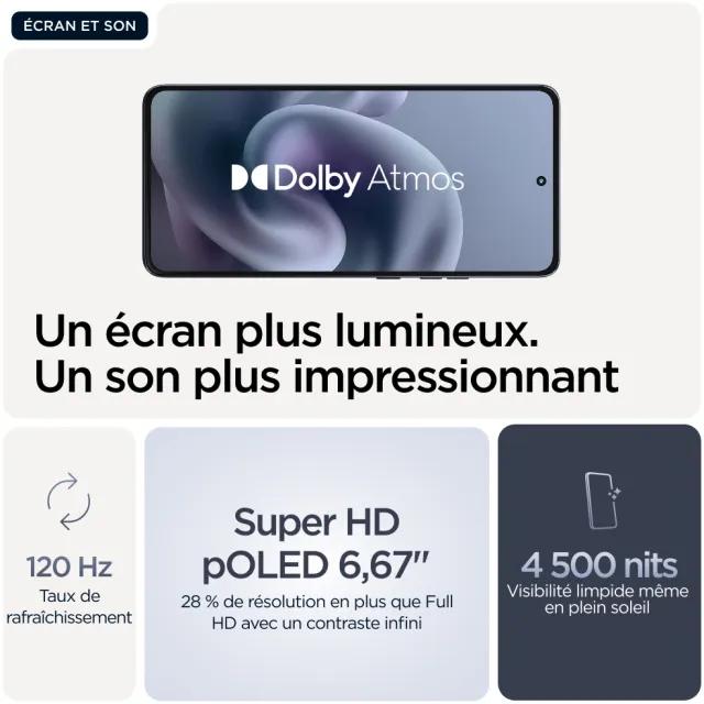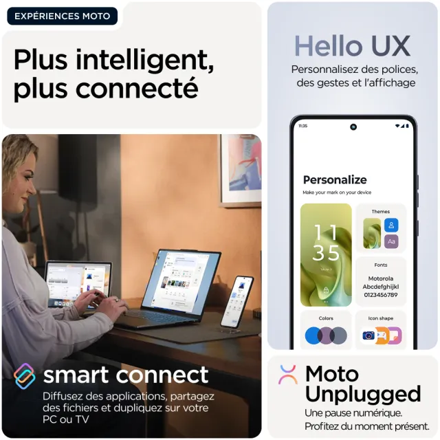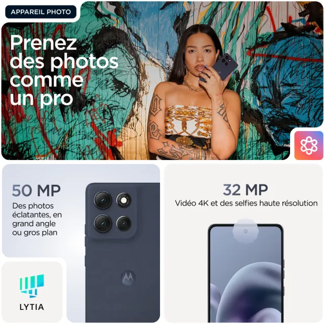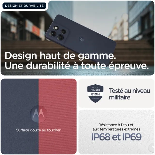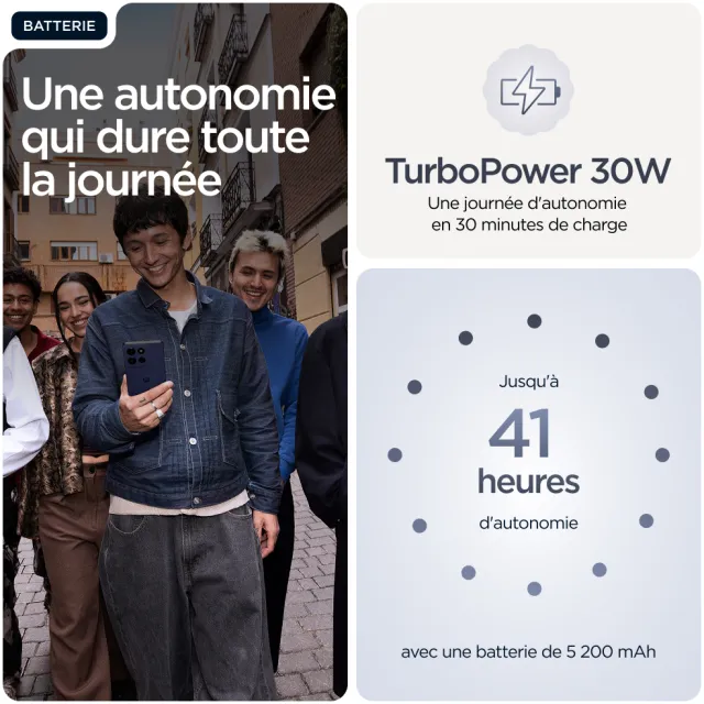 Un design audacieux. De grandes aventures. Découvrez le moto g86 5G, destiné à celles et ceux qui cherchent à repousser les limites. Soigneusement conçu à partir de matériaux de qualité, il se distingue par son design audacieux et une protection renforcée contre les éclaboussures et les chutes(6,7). Visualisez tous les contenus sur un écran Super HD (1220p) ultra lumineux de 6,67" accompagné du son Dolby Atmos®. Prenez des photos éblouissantes avec l’appareil photo Sony LYTIA™ 600 de 50 MP optimisé par moto ai(12) et capturez des images dignes d’un pro en toute facilité. Bénéficiez de plus de 41 heures d’autonomie en seulement quelques minutes grâce à la charge TurboPower™(1,13). Découvrez la puissance d’un processeur avancé, associée à 8 Go de RAM, extensible à 24 Go avec l’extension de RAM, et jusqu’à 256 Go d’espace de stockage(3,9). Laissez libre cours à votre créativité, interagissez sans effort et profitez d’une totale tranquillité d’esprit avec des expériences Moto exclusives. Vivez pleinement vos aventures avec le moto g86 5G.