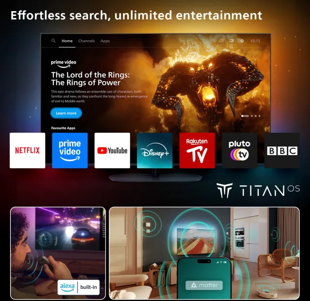 - 3 Sided Ambilight, Dolby Atmos®, Game Bar, HDR10+, Micro Dimming, Smart TV, TITAN OS, Works With Control4, Works With Google Assistant, Works With Matter, Works with Amazon Alexa