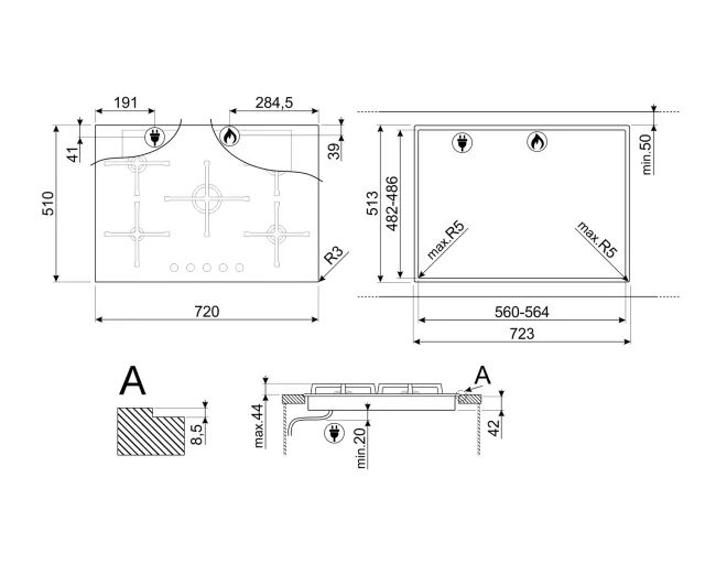 - 128e/183 parmi les plaques de cuisson Smeg 5 feux