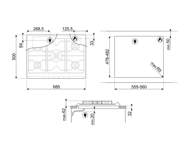 Smeg SRV575GH5 plaque Acier inoxydable Intégré 70 cm Gaz 5 zone(s)