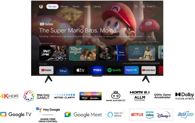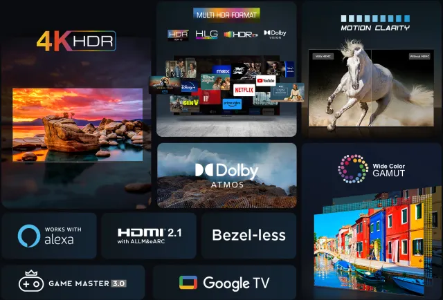 - 4K HDR Display, Apple AirPlay, DTS HD, Dolby Atmos®, Dolby Audio®, Game Master 3.0, Google TV, HDMI ARC, HDMI eARC, HDR (High Dynamic Range), Motion Clarity, T-cast