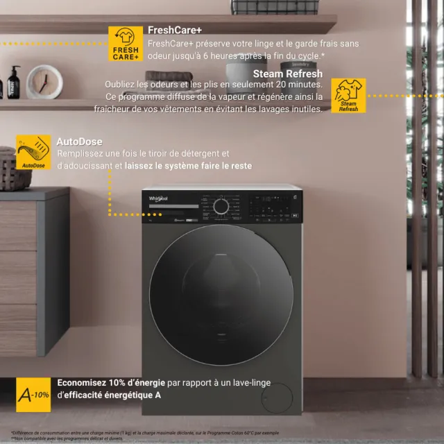 Découvrez le lave-linge WPM911GADSFR, conçu pour allier performance, design moderne (finition anthracite) et économies d’énergie. Avec sa capacité de 9 kg et une vitesse d’essorage de 1400 trs/min, il garantit un lavage efficace. La technologie Sense Wash alimentée par 6ème Sens adapte chaque lavage à votre charge. Ses capteurs intelligents adaptent chaque lavage à votre linge pour un soin optimal et un gain de temps. Le niveau de salissure de votre linge est également détecté et les réglages de lavage automatiquement adaptés pour des meilleurs résultats de lavage. Grâce à la technologie AdaptiveWash, vos cycles de lavage sont personnalisés selon vos besoins. Essorage, odeur, résidus ou rétrécissement : tout est ajusté pour un résultat parfait. Son système innovant de dosage automatique utilise des capteurs intelligents avancés pour évaluer avec précision la charge, le type de textile et le niveau de saleté, garantissant ainsi un dosage optimal de la lessive à chaque lavage, ce qui permet de réduire la consommation d'eau. L'option FreshCare permet un brassage intermittent du tambour en fin de cycle pour préserver la fraîcheur de votre linge. Profitez aussi du programme Steam Refresh (diffusion de vapeur) : les odeurs désagréables disparaissent et les plis sont lissés. Ce lave-linge hublot est doté de la connectivité : HomeWhiz lancez votre lessive à distance, ajuster les réglages et suivez son avancement en temps réel depuis votre téléphone. Son moteur à induction assure un fonctionnement silencieux et durable. Économe, il affiche une classe énergétique A-50% pour des économies maximales. Vous êtes pressés ? Ce lave-linge propose un cycle rapide, en seulement 28 minutes. Whirlpool recommande l'adoucissant Lenor et son parfum linge assorti pour un résultat 2X plus frais* ! * Avec usage de l'adoucissant et parfum de linge Lenor en plus de la lessive Ariel PODS Original par rapport à usage de la lessive Ariel PODS Originale seule.
